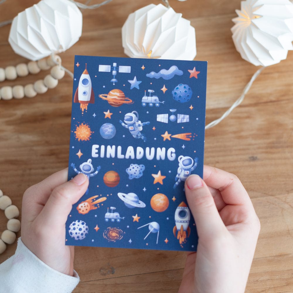 You will receive a set of 10 high-quality cards in DIN A6 postcard format. Printed on sturdy 300g/m² paper with a matt surface, they are very easy to write on without smudging. The matching kraft paper envelopes round off the set and make the invitations ready to send straight away. The cards are the perfect prelude to any space or astronaut theme and get little guests in the mood for a galactic adventure even before the party.