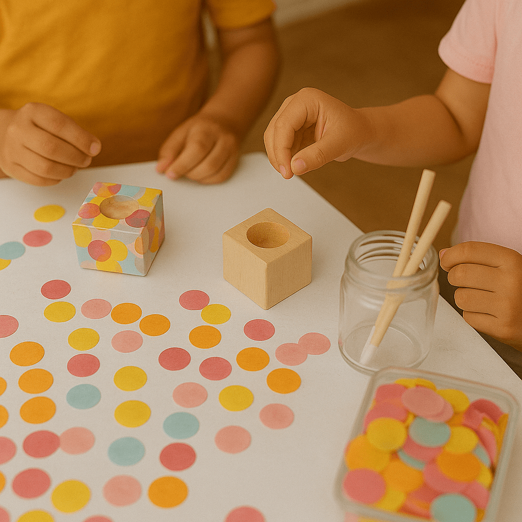 Stell Dir vor, wie am Geburtstagstisch konzentrierte Stille einkehrt. Jedes Kind vertieft sich in sein eigenes kleines Kunstwerk. Mit Pinsel und Kleber tupfen sie bunte Konfetti-Punkte auf ihren Holzwürfel und sehen stolz zu, wie ein einzigartiger Kerzenhalter entsteht. Für Dich bedeutet das eine wunderbar ruhige und kreative Beschäftigung für die ganze Rasselbande. Das Set enthält alles für bis zu acht Kinder, Du musst nichts extra besorgen. Am Ende hat jedes Kind ein selbstgemachtes, nützliches Mitgebsel, das es stolz mit nach Hause nimmt.