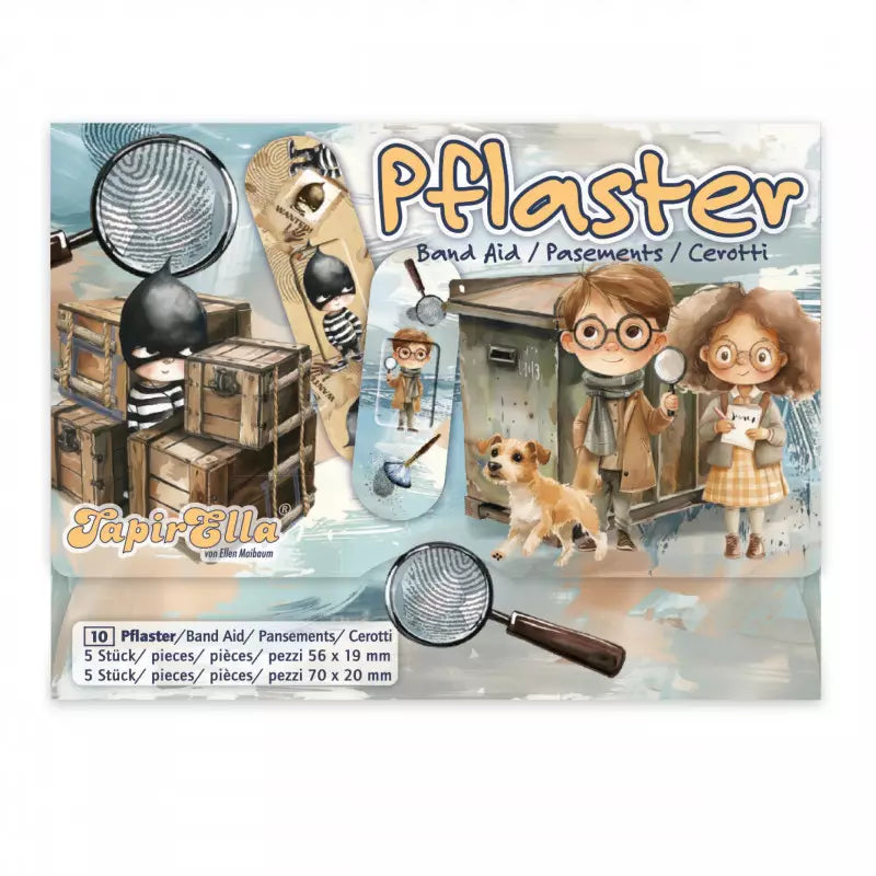 Dieses Set besteht aus 10 einzeln verpackten Pflasterbriefchen, perfekt zum Aufteilen. Jedes Briefchen enthält 5 hautfreundliche Pflaster in zwei verschiedenen Grössen und gehemnisvollen Detektiv-Designs. Die Pflaster sind hypoallergen, latexfrei und wasserabweisend, sodass sie auch beim Händewaschen oder bei den nächsten Abenteuern gut halten. Eine sinnvolle Kleinigkeit, die im Alltag immer wieder zum Einsatz kommt und in jede Handtasche oder jeden Rucksack passt.