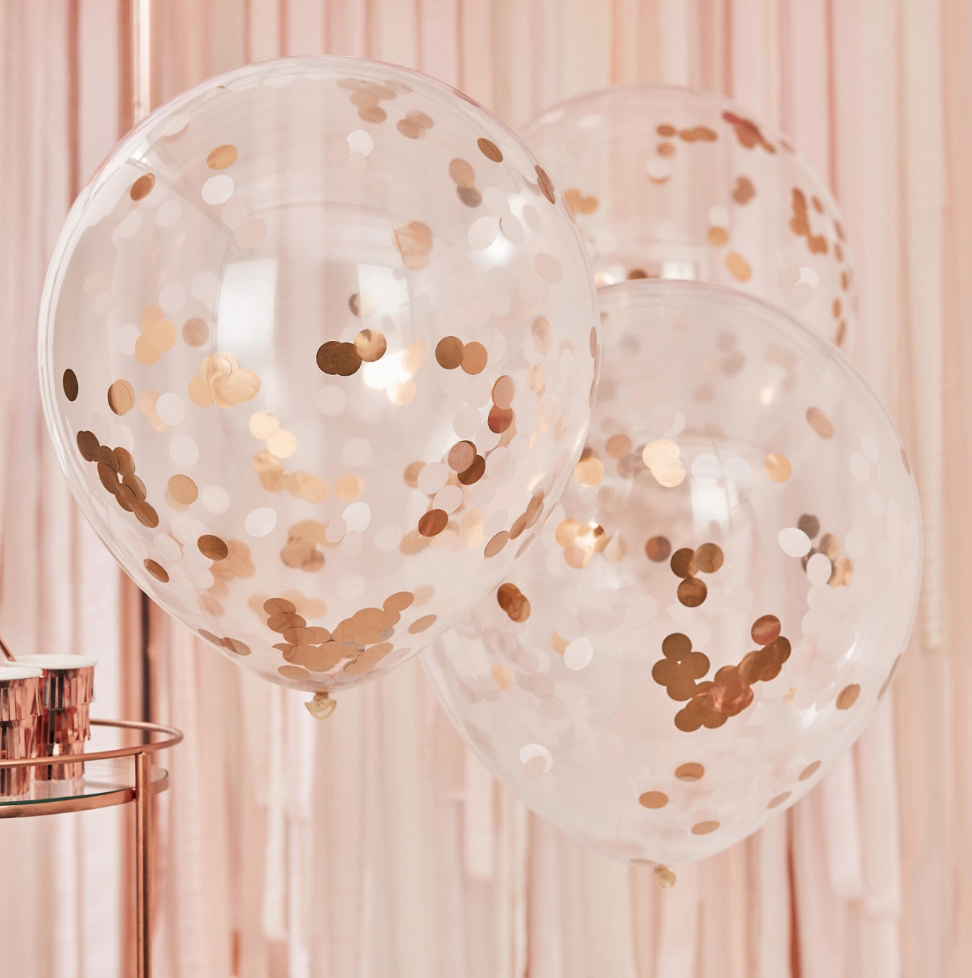 Tu recevras un set de trois ballons en latex transparent de haute qualité, qui atteignent un diamètre impressionnant de 56 cm. Il te suffit de remplir les ballons de confettis en or rose brillant avant de les gonfler. Un petit conseil pour obtenir le meilleur effet : frotte le ballon gonflé contre un tissu pour le charger d'électricité statique. Ainsi, les confettis se répartiront à l'intérieur et ne flotteront pas seulement au sol. Les ballons peuvent être remplis d'air ou d'hélium.