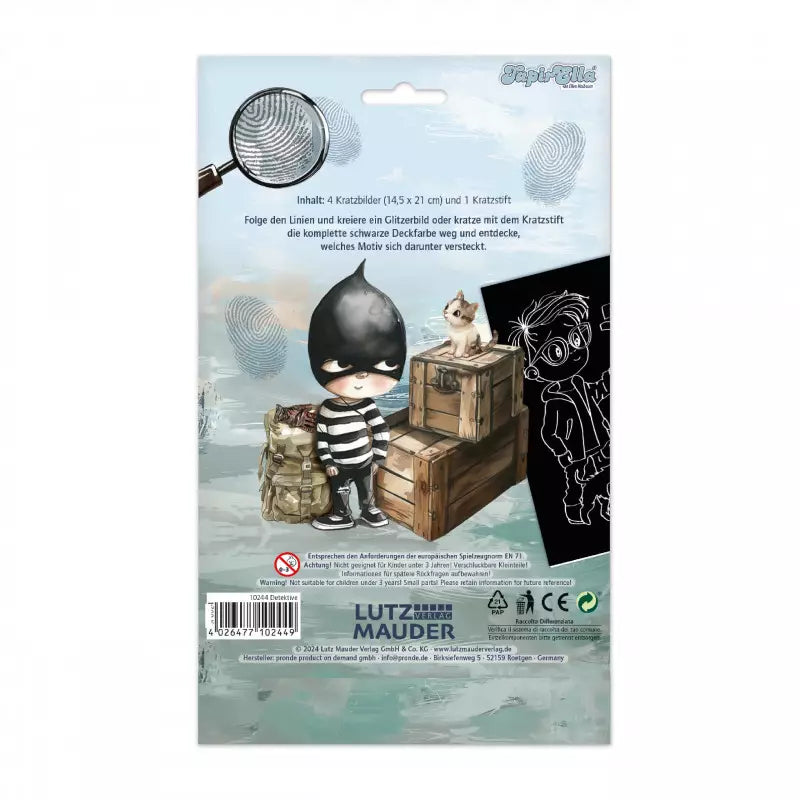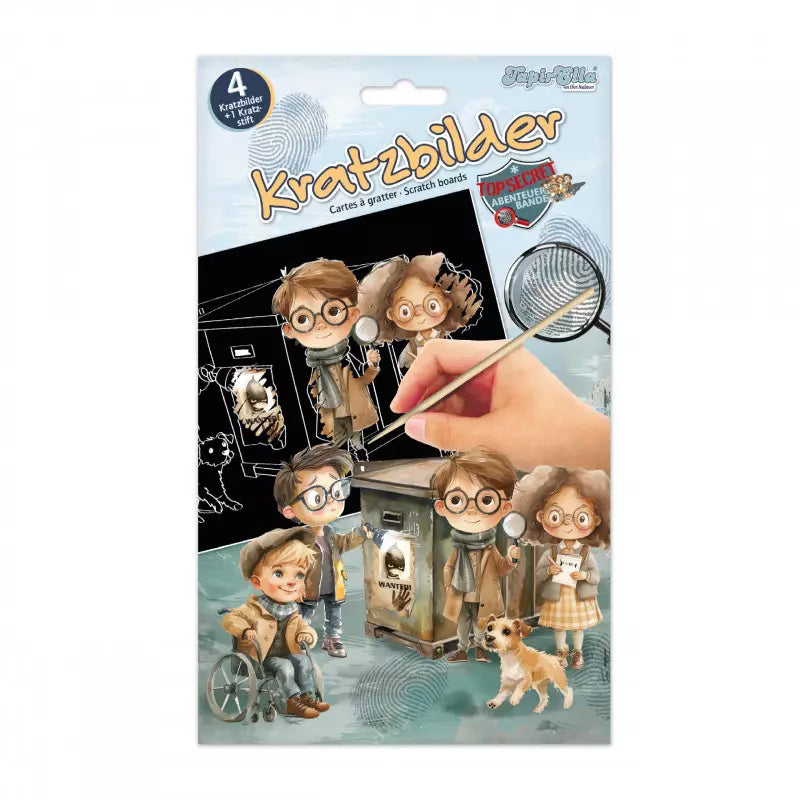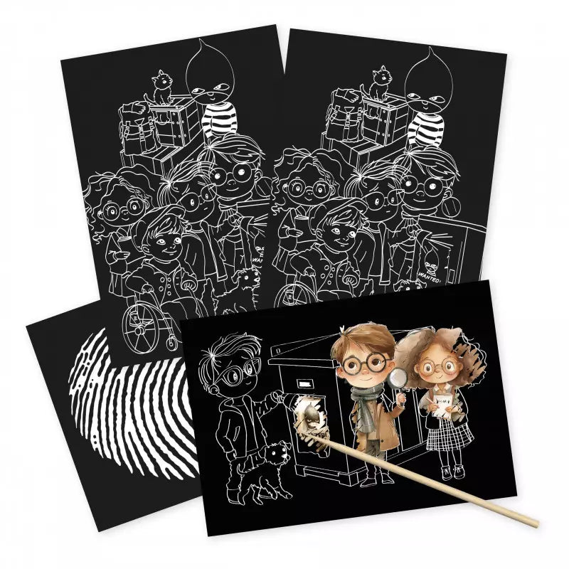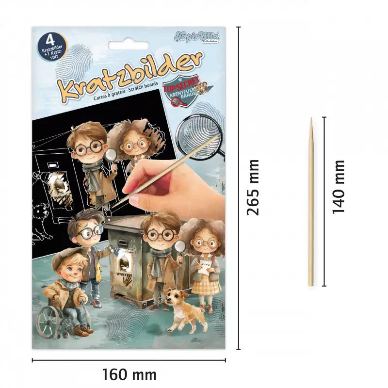 Dieses Set ist perfekt als Mitgebsel für eine Detektivparty, als kleine Beschäftigung während des Festes oder als Füllung für den Adventskalender. Es enthält vier verschiedene Kratzbilder im praktischen Postkartenformat (DIN A6) und den passenden Kratzstift aus Holz. Dank der kompakten Grösse passen die Bilder in jede Mitgebseltüte und sind eine willkommene Abwechslung zu Süssigkeiten. So schaffst Du ohne grossen Aufwand ein kreatives Highlight.