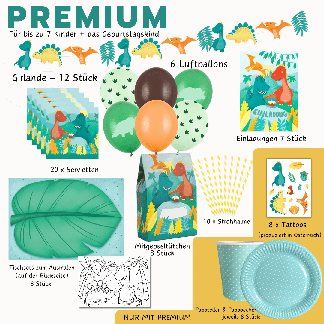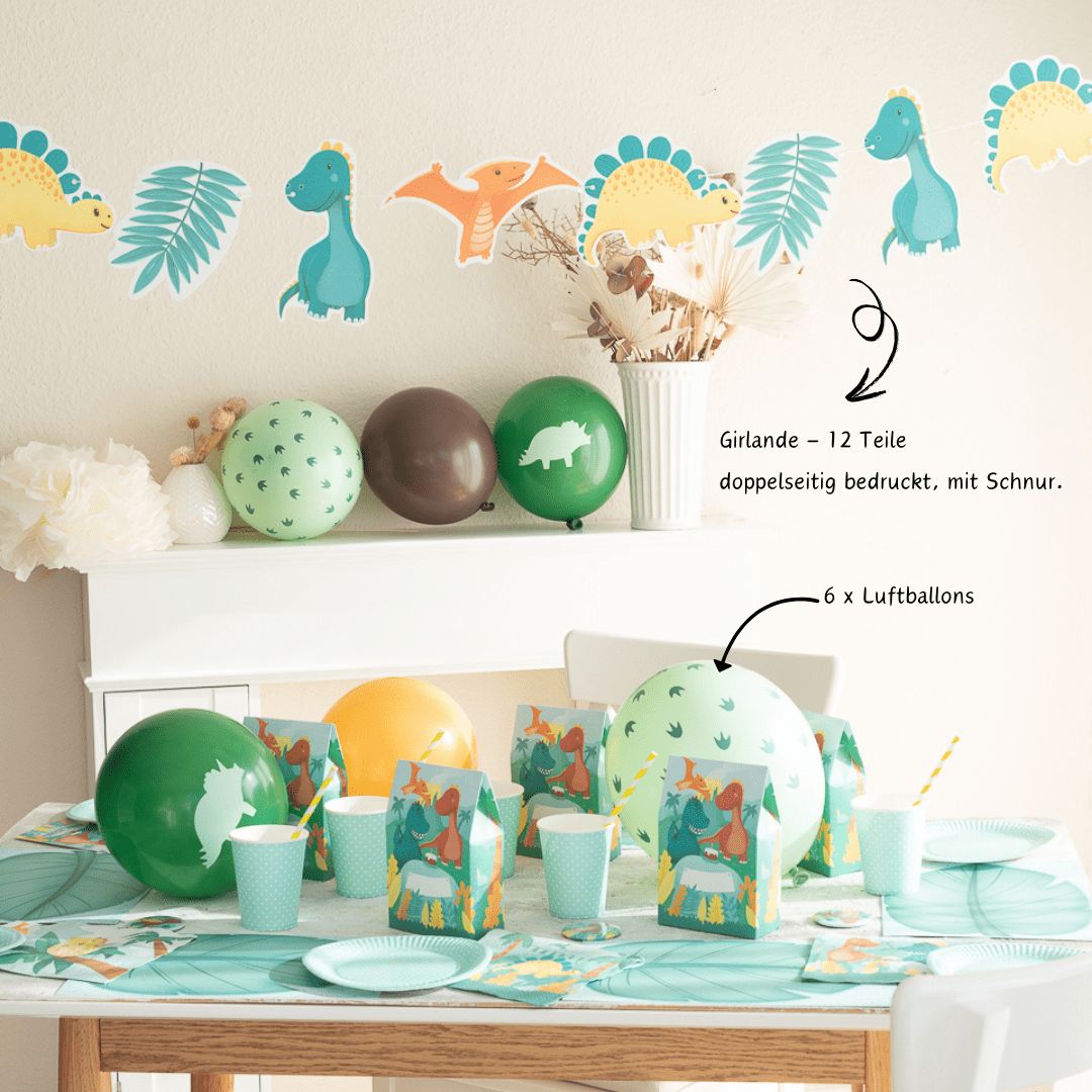In dieser praktischen Mottobox findest Du eine komplette Grundausstattung für acht kleine Gäste. Sie enthält Einladungskarten, Teller, Becher, Servietten und Partytüten. Für die Dekoration sind eine passende Tischdecke, eine Girlande und Ballons enthalten. Sogar an den Kuchen ist gedacht: mit Muffinförmchen und passenden Steckern. Die enthaltenen Platzkarten und Malvorlagen sorgen für zusätzliche Beschäftigung und eine liebevolle Tischordnung. Alle Teile sind mit kinderfreundlichen Dinos illustriert und schaffen eine stimmige Atmosphäre.