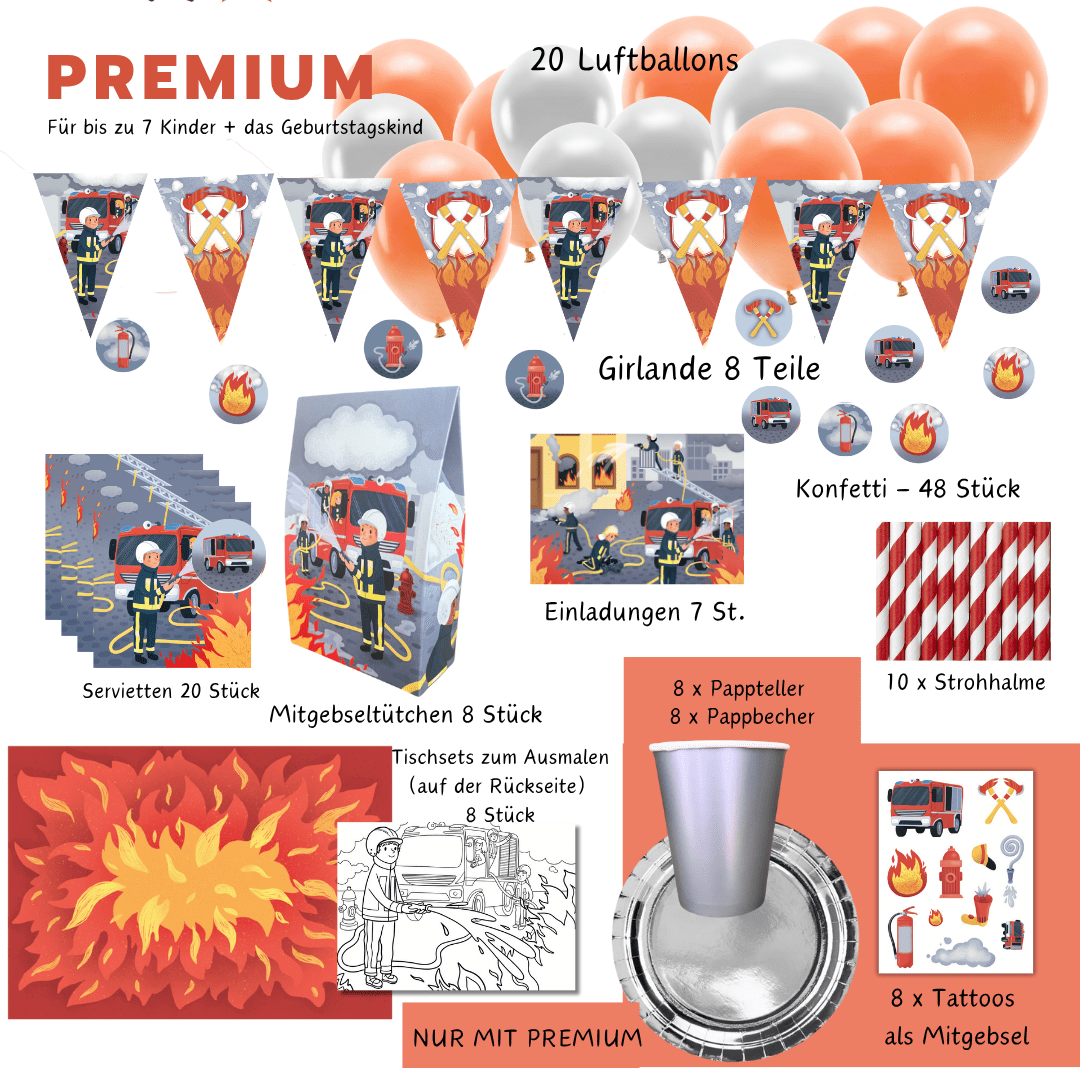 Dieses komplette Partyset für acht kleine Feuerwehrleute wurde mit viel Liebe zum Detail gestaltet und ist komplett plastikfrei. Es enthält alles, um Deinen Partyraum in eine Einsatzzentrale zu verwandeln: Eine 2,5 Meter lange Wimpelkette, passende Einladungskarten, Stickervorlagen und sogar ein lustiges Feuerwehr-Bingo. Die Papiertüten für die Mitgebsel und die Streudeko runden das Paket ab. So gelingt Dir die Vorbereitung im Handumdrehen und es bleibt mehr Zeit für das Wichtigste: den Spass Deines Kindes.