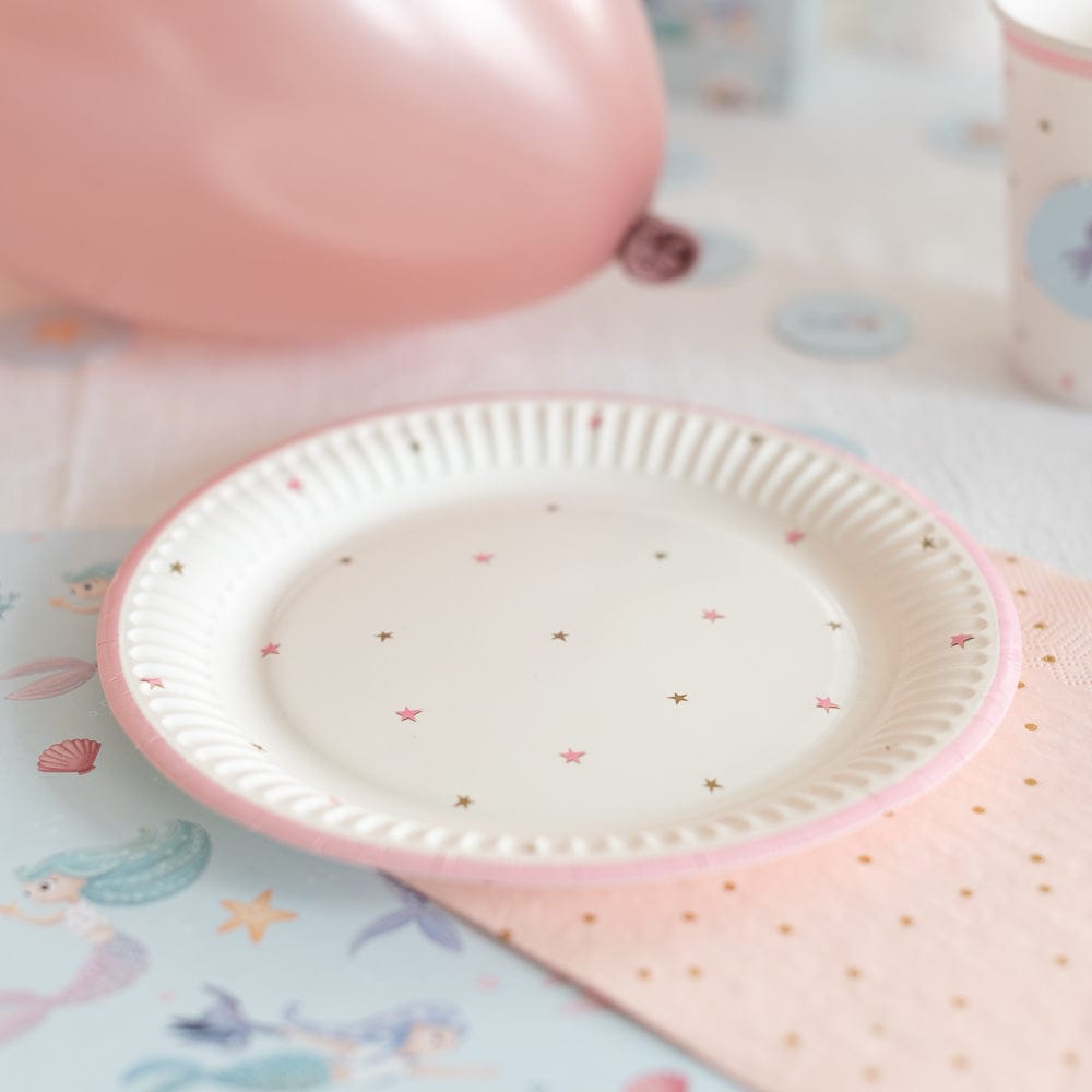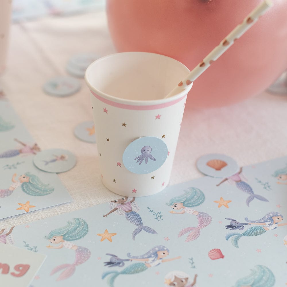 Dieses umfangreiche Party Set ist für 8 Kinder ausgelegt und lässt keine Wünsche offen. Es enthält alles, was Du für eine gelungene Feier brauchst: Einladungskarten, Teller, Becher, Servietten und Partytüten im zauberhaften Meerjungfrauen-Design. Für die passende Atmosphäre sorgen eine Wimpelkette, Luftballons und passendes Tischkonfetti. Das Highlight sind die integrierten Aktivitäten: eine komplette Schatzsuche, ein Bastelset für Muschel-Ketten und Ausmalbilder, die für spannende Unterhaltung sorgen.