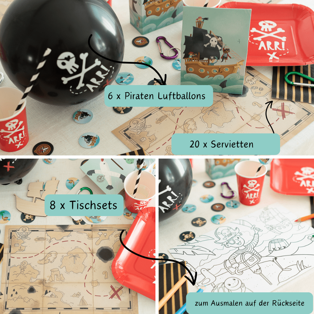 Dieses Partyset ist sorgfältig für 8 Kinder zusammengestellt und enthält alles vom Geschirr bis zur Dekoration. Neben Tellern, Bechern und Servietten findest Du auch eine "Happy Birthday"-Girlande, die sofort für festliche Stimmung sorgt. Die beiliegenden Einladungskarten samt Umschlägen kannst Du direkt an die kleinen Gäste verteilen. Mit den Mitgebseltüten und den vielen Stickern hast Du auch gleich eine Idee für kleine Gastgeschenke. Die grosse Schatzkarte kann als Tischdeko oder als Startpunkt für eine spannende Schatzsuche genutzt werden.