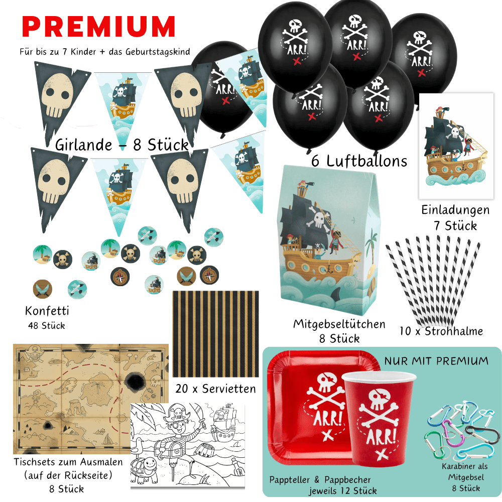 Stell Dir vor, die kleinen Gäste halten schon eine abenteuerliche Piraten-Einladung in den Händen. Am Geburtstag selbst staunen sie über einen vollständig gedeckten Tisch, der sie direkt auf ein Piratenschiff entführt. Mit dieser Box hast Du alles, was Du für eine stimmige Party brauchst, in einem Paket. Kein langes Suchen nach passender Deko und Geschirr mehr. Du deckst den Tisch, hängst die Girlande auf und die Party kann beginnen. Für Dich bedeutet das maximale Freude bei minimalem Vorbereitungsstress, sodass Du das Fest gemeinsam mit Deinem Kind geniessen kannst.