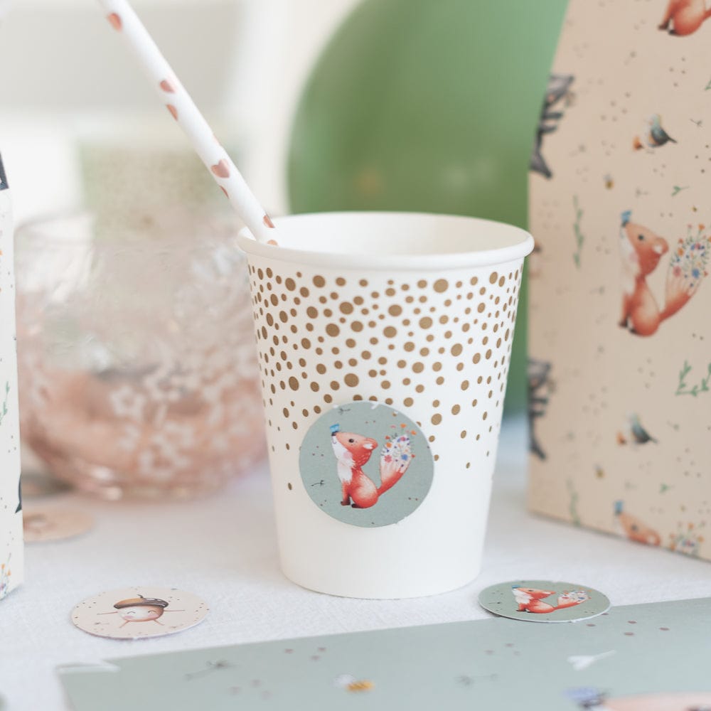 Dieses durchdachte Party Deko Set für acht Kinder enthält alles von den Einladungskarten über die Tischdeko bis hin zu kleinen Gastgeschenken. Die Dekoration wie die Wimpelkette und das Willkommensposter verwandeln jeden Raum in einen verwunschenen Wald. Mit den Tiermasken, dem Partyspiel und den Buttons für die Geschenktüten ist auch für Spiel und Spass gesorgt. Alle Elemente sind mit liebevollen Aquarell-Motiven gestaltet und aus hochwertigen, grösstenteils plastikfreien Materialien gefertigt. So feierst Du nicht nur schön, sondern auch mit einem guten Gefühl.