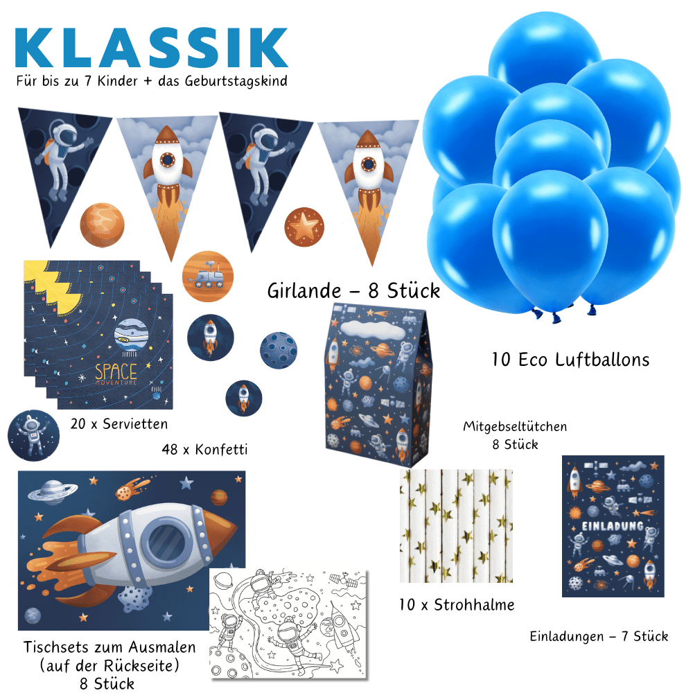 Dieses 64-teilige Partyset ist für eine Crew von bis zu acht Kindern ausgelegt. Es enthält Teller, Becher, Servietten, Einladungskarten mit Umschlägen und sogar Papiertüten für die Mitgebsel. Eine passende Wimpelgirlande, Luftballons und Tischkonfetti runden das Paket ab und verwandeln jeden Tisch in eine Kommandozentrale. Alle Teile sind aus Papier oder Pappe gefertigt und mit liebevollen Weltraum-Motiven bedruckt, die Jungen und Mädchen gleichermassen ansprechen. Nach der Party ist das Aufräumen schnell erledigt.