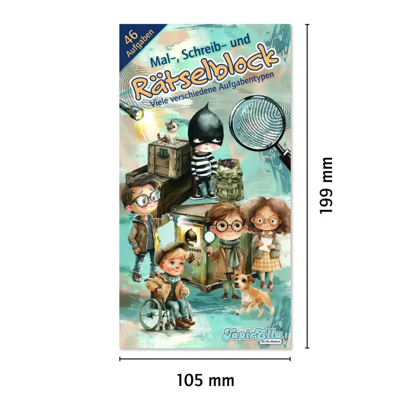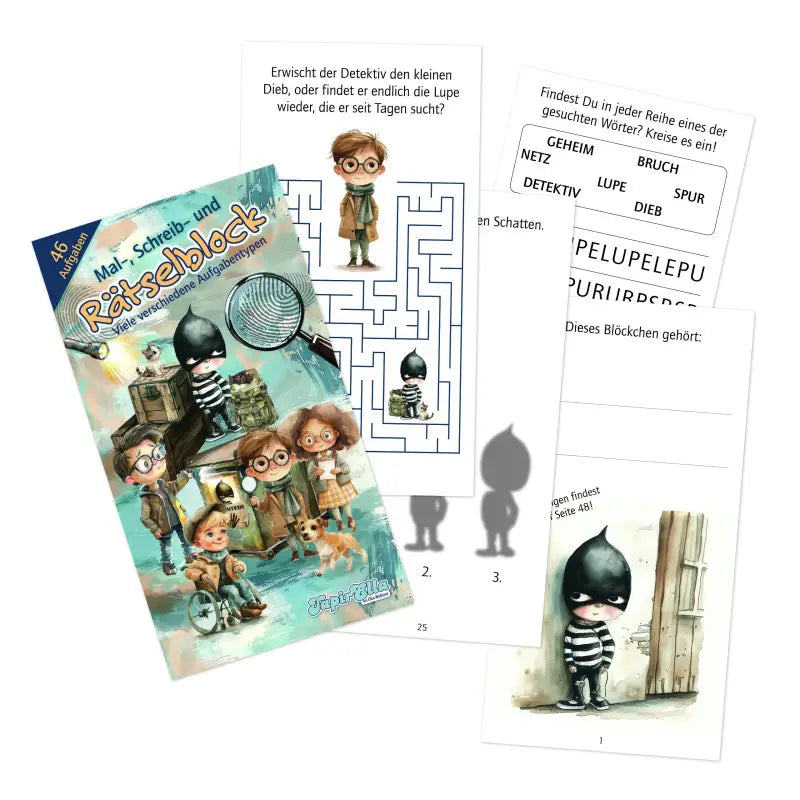 Dieser Mal-, Schreib- und Rätselblock im handlichen Format ist das ideale Mitgebsel für jede Detektivparty. Auf 46 Seiten finden die Kinder abwechslungsreiche Aufgaben, die zum Malen, Knobeln und Kombinieren einladen. Dank der Gestaltung lassen sich die Seiten auch einzeln verwenden, zum Beispiel als Stationen bei einer Schatzsuche oder als kleines Spiel zwischendurch. So hast Du ein vielseitiges Gastgeschenk, das noch lange nach der Party für Freude sorgt.