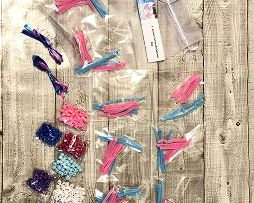 Für diese Bastelidee benötigst Du etwas kürzere Pfeifenputzer in rosa und blau, Perlen deiner Wahl (beispielsweise auf unserem Onlineshop) und wenn Du möchtest auch Schleifchen.