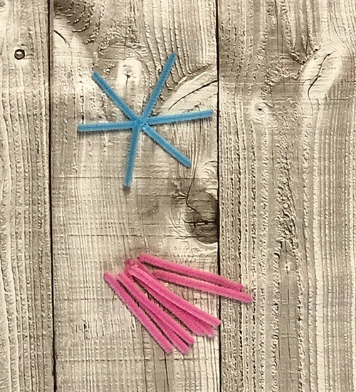 Aus drei blauen Pfeifenputzern entsteht ganz einfach das Grundgerüst für eine Schneeflocke: Zwei Pfeifenputzer werden zuerst zu einem Kreuz gelegt und in der Mitte miteinander verdreht. Der dritte Pfeifenputzer wird dann schräg darübergelegt und ebenfalls in der Mitte festgedreht, sodass ein sechszackiger Stern entsteht. Die rosanen bleiben erstmal einzeln. Natürlich kann man auch statt einer blauen Schneeflockenbasis eine rosane erstellen.