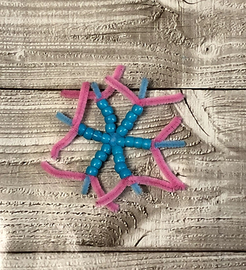 Anschließend wird die aus den drei blauen Pfeifenputzern geformte Basis mit Perlen und rosa Pfeifenputzern verziert. Auf jeden der sechs blauen Arme wurden mehrere blaue Perlen aufgefädelt, um den typischen eisigen Look wie bei Elsa zu erzeugen. Anschließend wurden kurze Stücke rosa Pfeifenputzer kunstvoll zwischen den Armen befestigt – sie bilden die zarten Schneeflockenzacken.