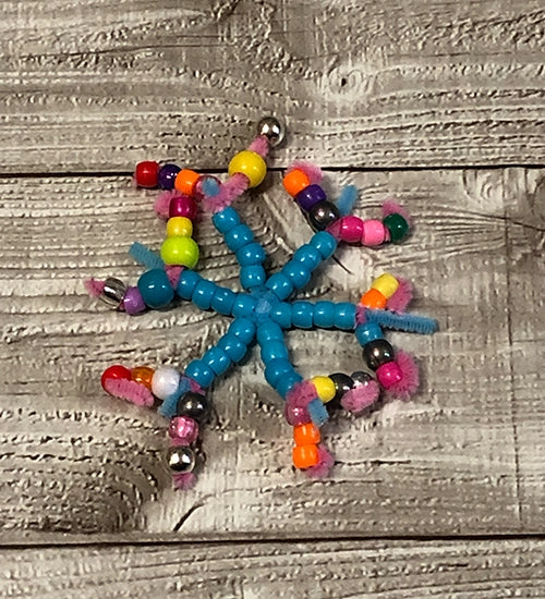Zuletzt können auf die rosanen (oder je nach Wunsch blauen) Arme weitere bunte Perlen aufgefädelt werden. Am Ende werden noch die Pfeifenputzer leicht umgeknickt, damit die Perlen nicht abrutschen und gleichzeitig dekorative Zacken entstehen. So entsteht eine farbenfrohe, verspielte Schneeflocke mit Glöckchen-Effekt – ideal zum Aufhängen oder Verschenken.