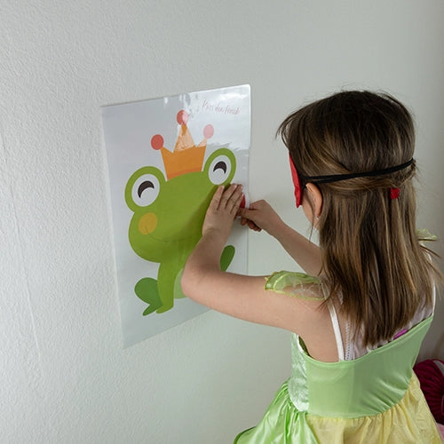 Klebe ein Poster Deine Favoriten-Prinzessin an die Wand. Verbinde die Augen und setze (kleibe) Deiner Prinzessin eine Krone auf.