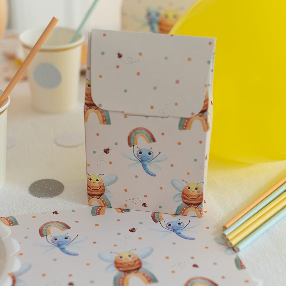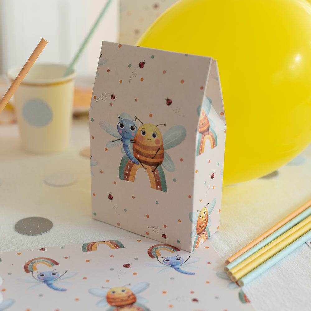 Du erhältst 10 stabile Geschenktüten aus Pappe. Mit einer Grösse von 14 x 9 x 5 cm bieten sie genug Platz für kleine Mitgebsel, Süssigkeiten oder ein Stück vom Geburtstagskuchen. Dank des flachen Bodens stehen die Tütchen von allein und lassen sich wunderbar auf einem Geschenktisch arrangieren. Das liebevolle Design mit Biene, Libelle, Regenbogen und kleinen Marienkäfern in zarten Pastellfarben passt perfekt zu einer fröhlichen Natur-Mottoparty.