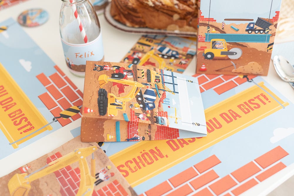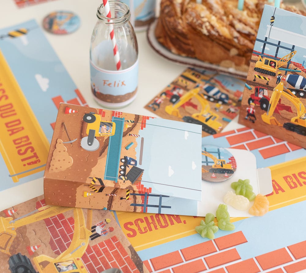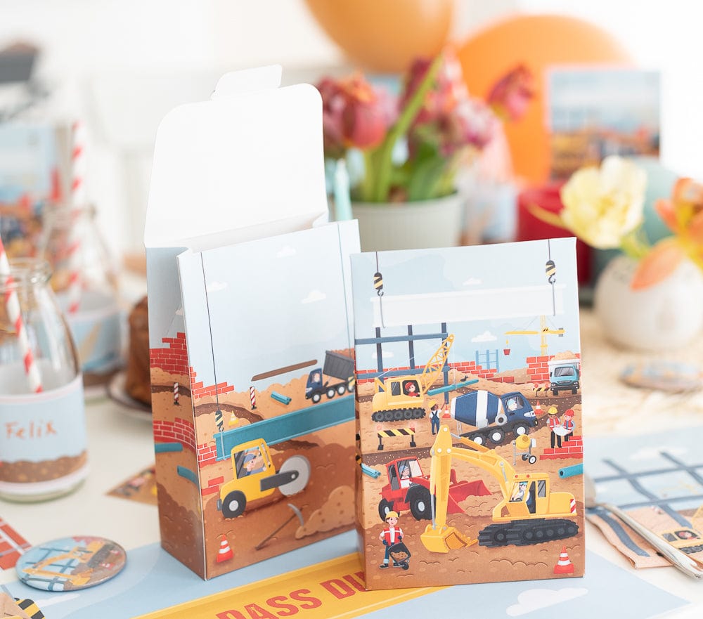 Am Ende eines aufregenden Baustellen-Geburtstags bekommt jedes Kind seine eigene kleine Schatzkiste. Die Augen leuchten, wenn die kleinen Gäste die vielen Bagger, Kräne und Betonmischer auf ihrer Mitgebselbox entdecken und sie stolz nach Hause tragen. Für Dich bedeutet das einen entspannten Party-Abschluss: Die Boxen sind im Handumdrehen aufgefaltet und dank des stabilen Bodens schnell mit kleinen Überraschungen befüllt. Kein langes Basteln, kein Klebeband - einfach falten, füllen und Freude schenken.