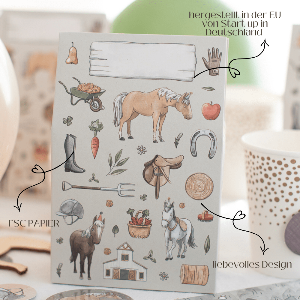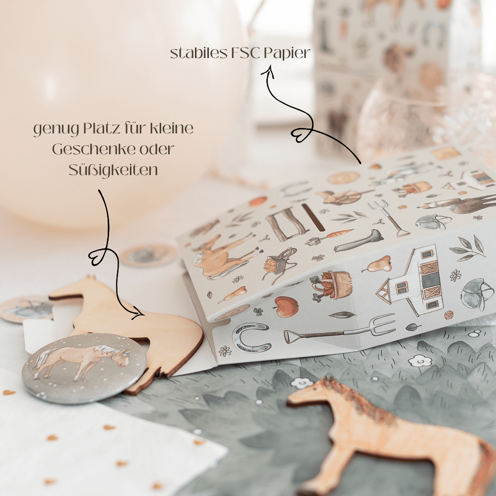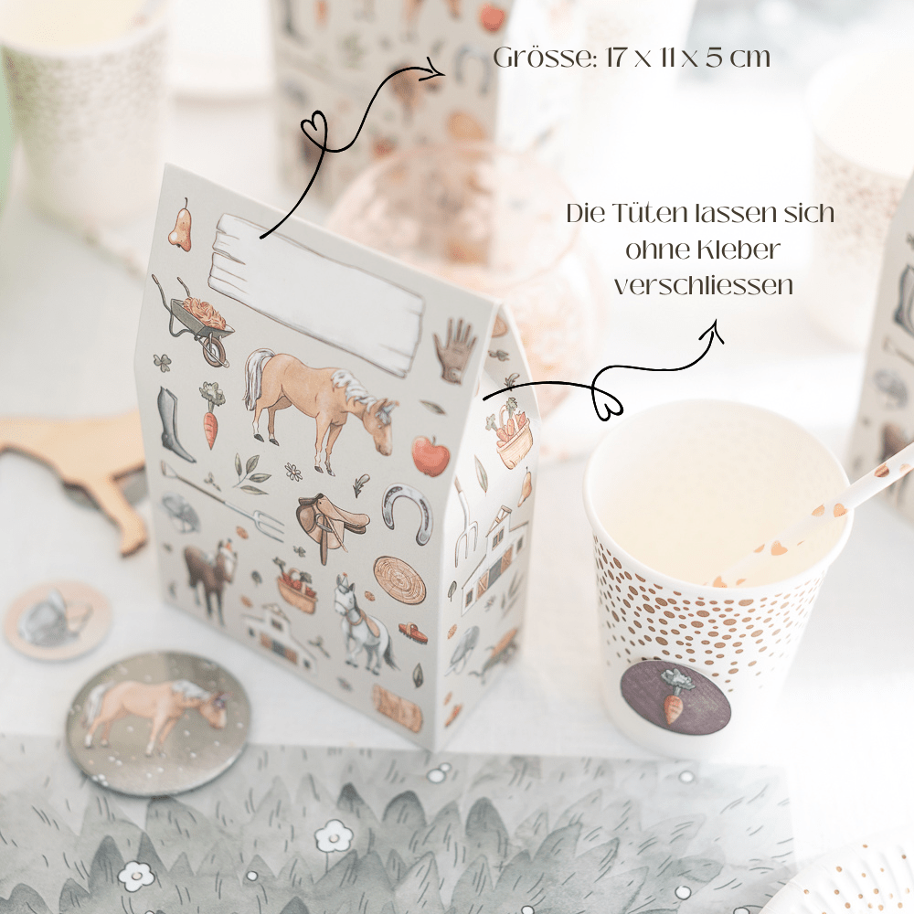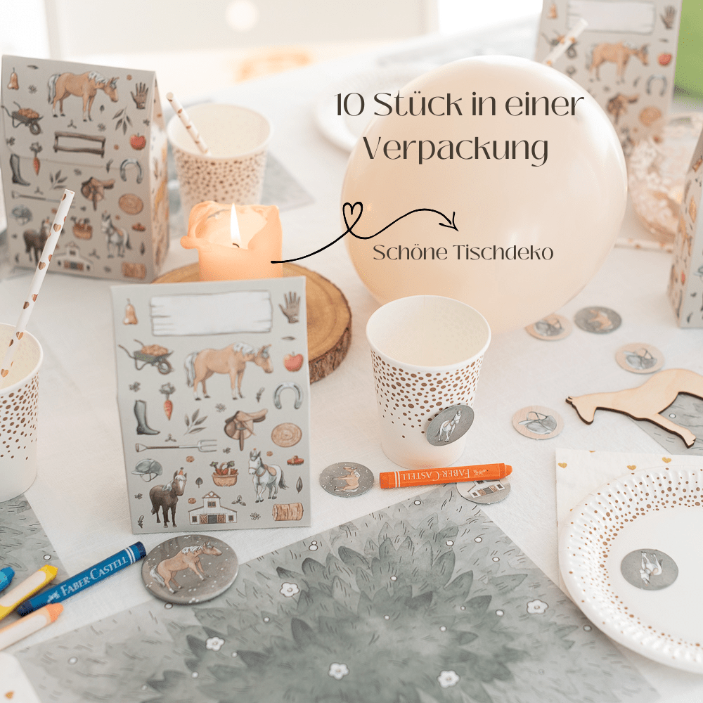 Stell Dir die leuchtenden Augen der kleinen Partygäste vor, wenn sie am Ende des Tages eine dieser liebevoll gestalteten Pferdetüten in den Händen halten. Jedes Kind kann seinen Namen auf das vorgesehene Feld schreiben und stolz seinen kleinen Schatz mit nach Hause nehmen. Für Dich bedeutet das eine stressfreie Vorbereitung: Die Tüten werden flach geliefert, lassen sich mit wenigen Handgriffen auffalten und sind sofort bereit, mit kleinen Überraschungen gefüllt zu werden. Kein Kleben, kein langes Basteln - einfach nur Freude verschenken.