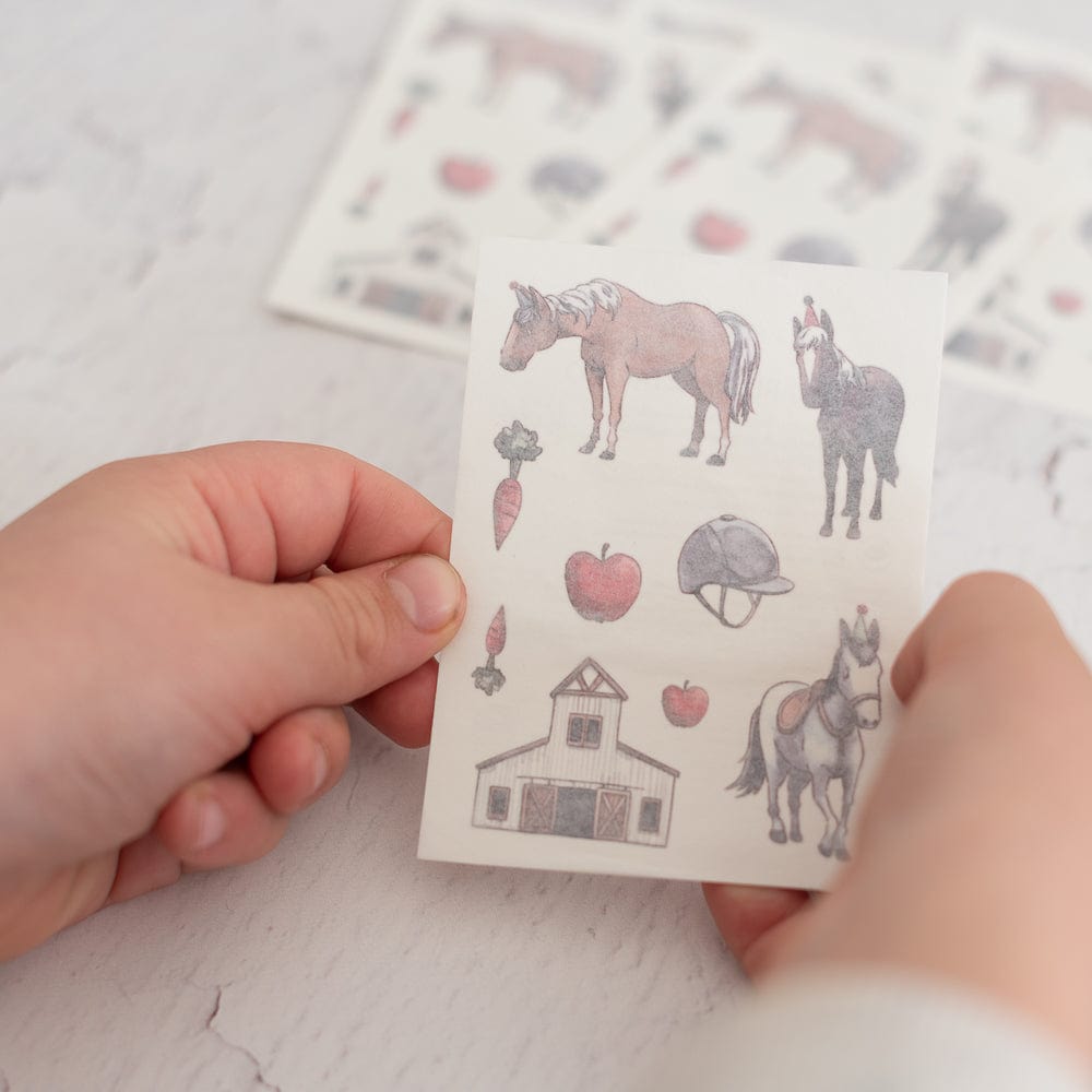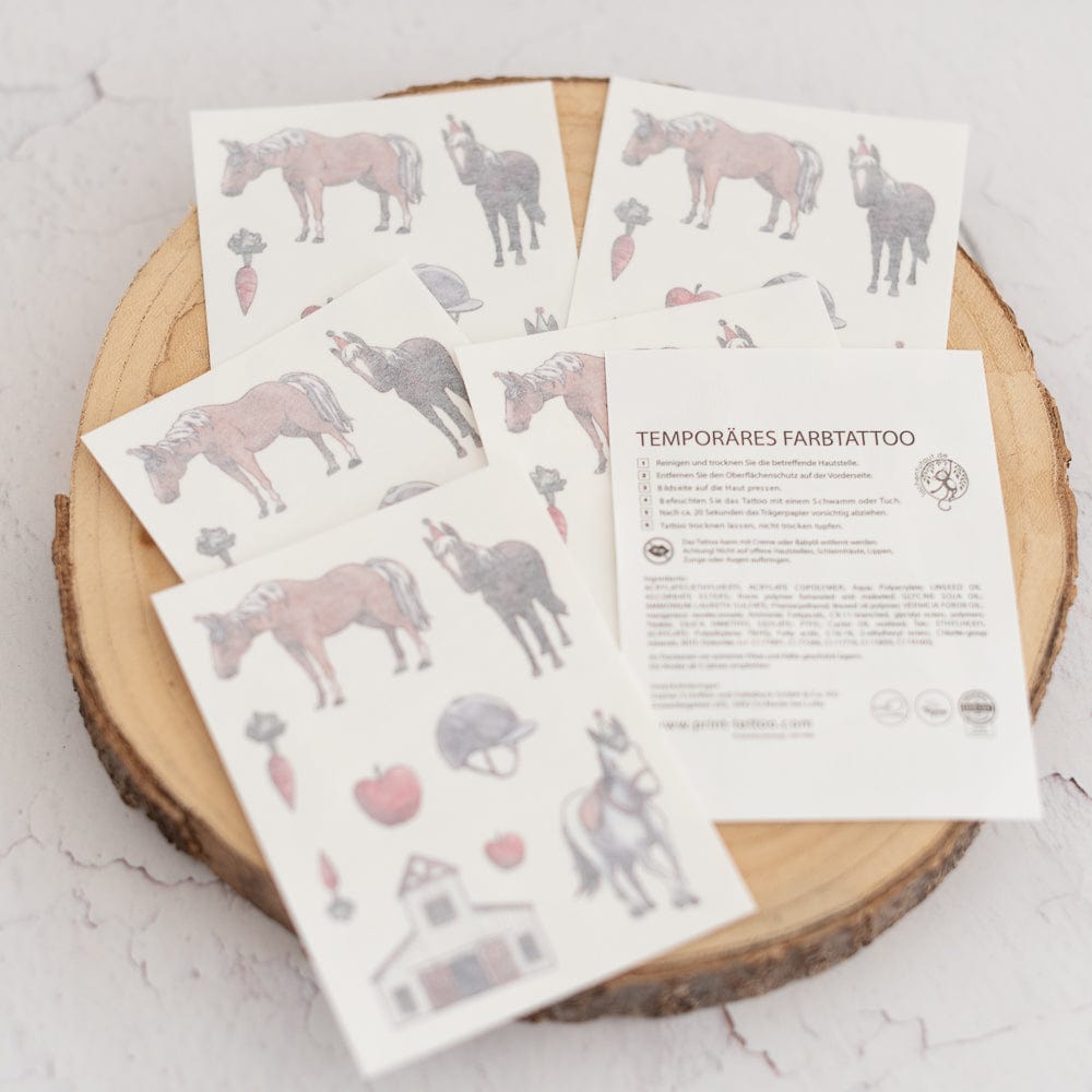 In diesem Set erhältst Du 10 einzelne Bögen, gefüllt mit verschiedenen Motiven rund um das Thema Pferd - von süssen Ponys mit Partyhütchen bis hin zu Reitkappen und Stallgebäuden. Jeder Bogen kann einzeln genutzt werden, was sie ideal für die Verteilung an mehrere Kinder macht. Die Anwendung ist denkbar einfach: Motiv ausschneiden, Folie abziehen, auf die Haut pressen und mit Wasser befeuchten. Genauso unkompliziert lassen sie sich später mit etwas Baby- oder Speiseöl wieder entfernen.