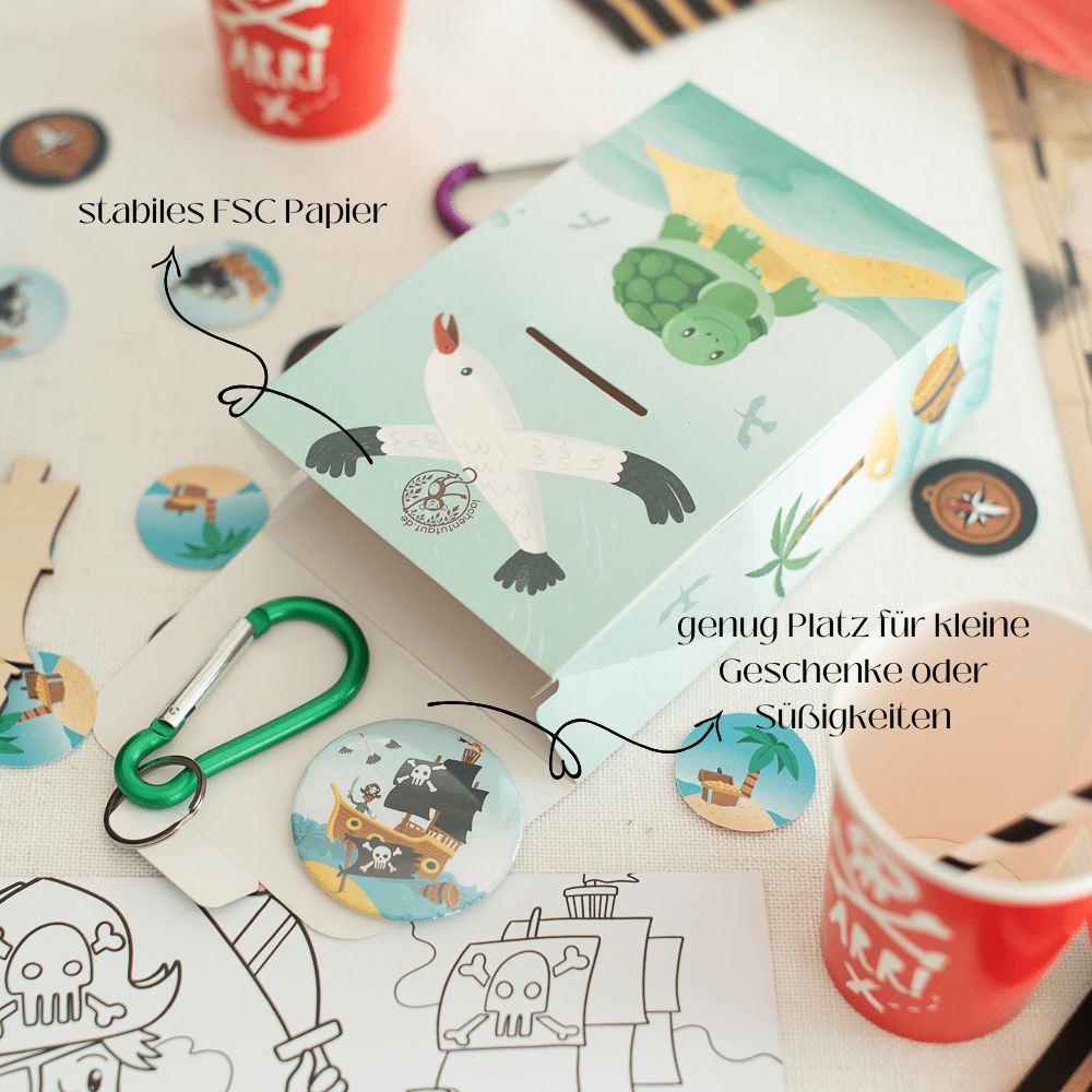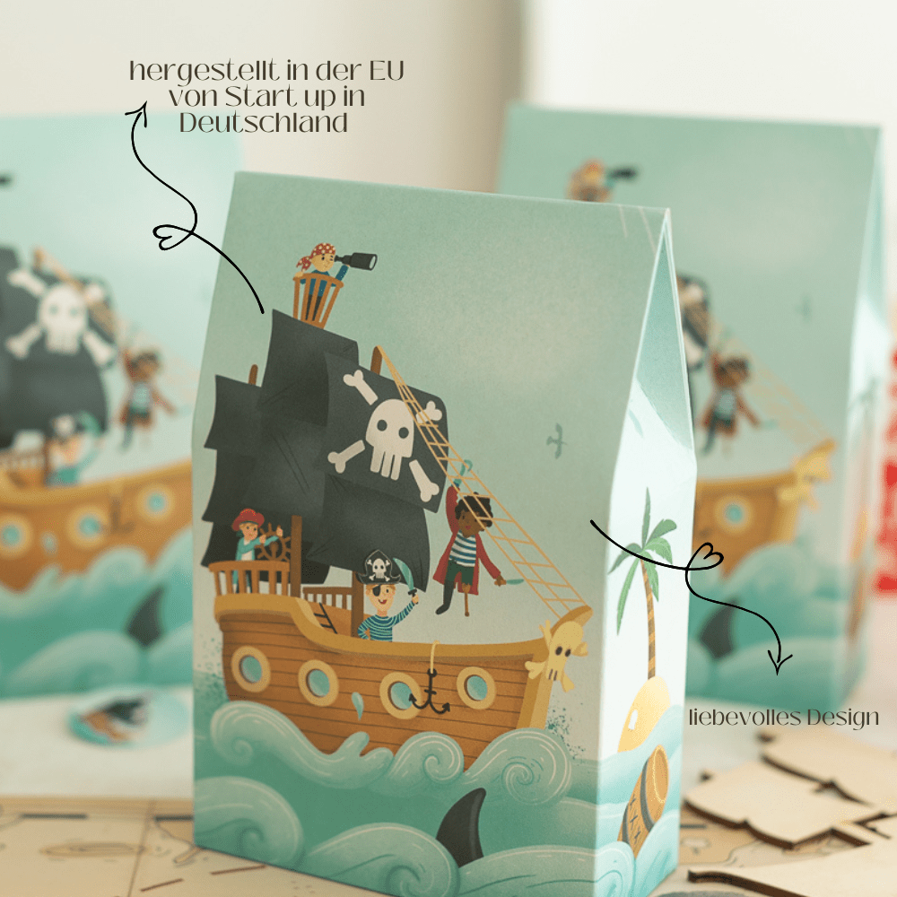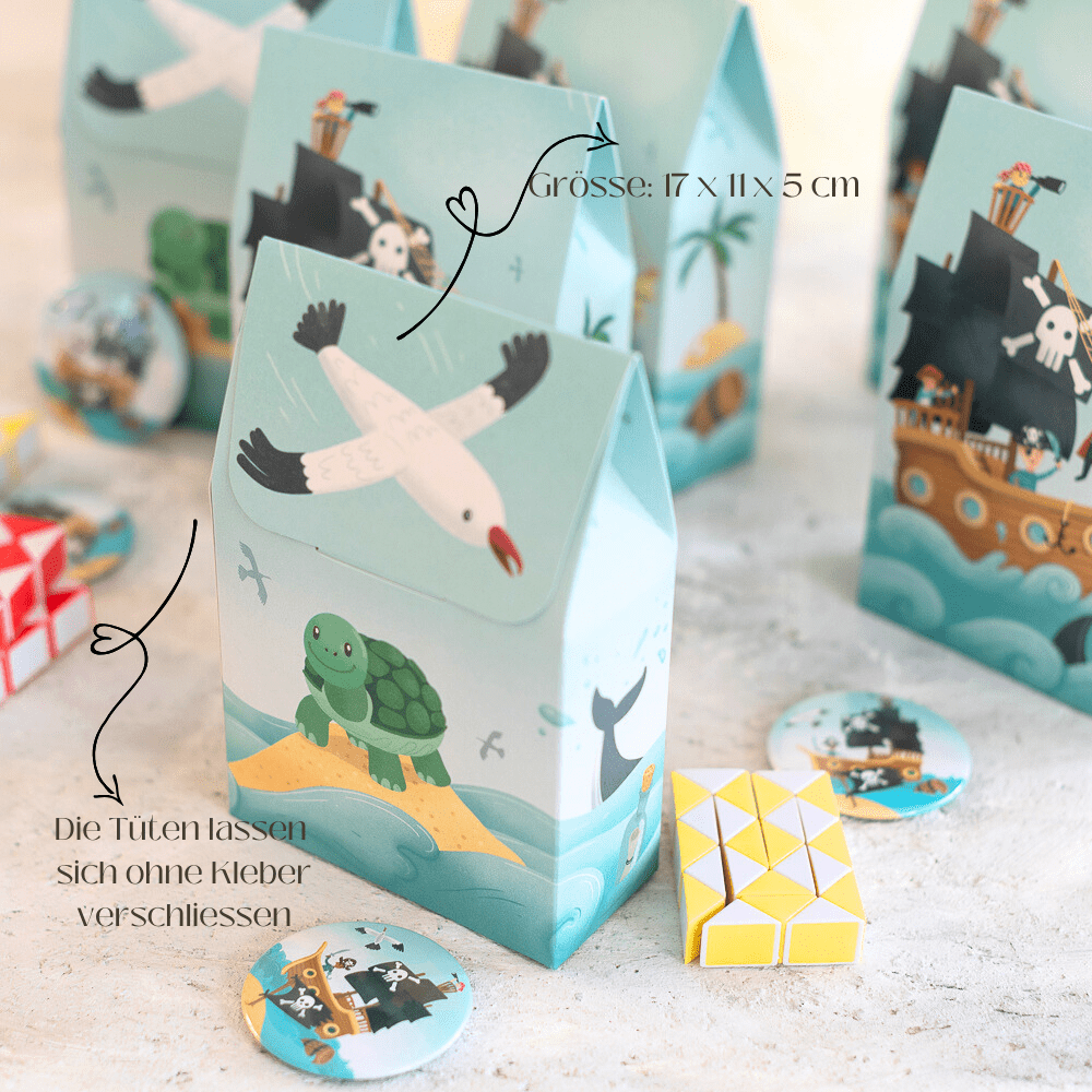 Stell Dir die leuchtenden Augen der kleinen Gäste vor, wenn sie am Ende der Piratenparty ihre eigene kleine Schatztüte erhalten. Jedes Kind hält stolz seine Beute in den Händen und freut sich über die Überraschungen darin. Für Dich ist die Vorbereitung ganz entspannt: Dank des praktischen Standbodens bleiben die Tütchen von alleine stehen und lassen sich kinderleicht befüllen. Einfach kleine Mitgebsel und Süssigkeiten hineingeben, zuklappen und die kleinen Piraten glücklich machen.