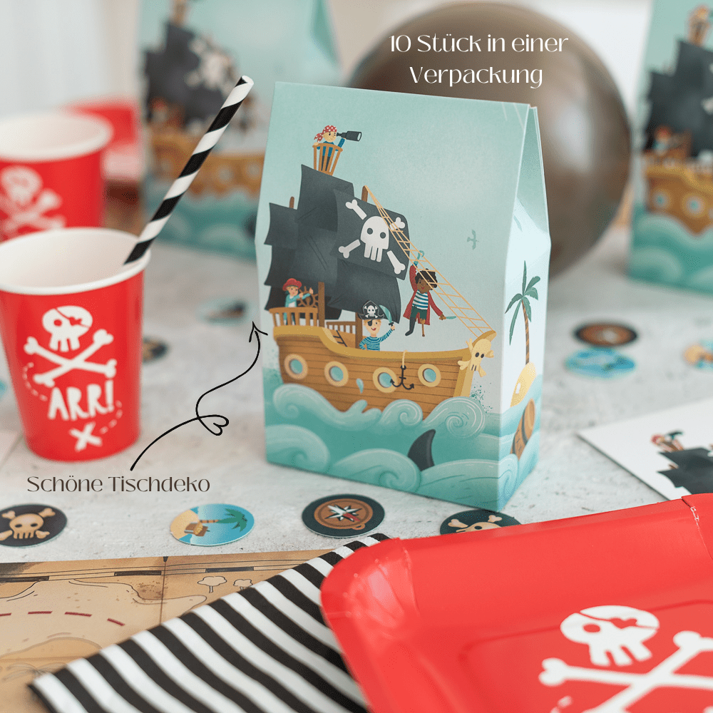Du erhältst 10 stabile Papiertüten mit einem liebevoll gestalteten Piratenmotiv. Mit einer Grösse von etwa 20 x 12 x 8 cm bieten sie ausreichend Platz für die typischen Schätze und Andenken. Die Tüten sind nicht nur eine Verpackung, sondern auch ein Teil des Party-Erlebnisses. Sie eignen sich perfekt als Abschluss einer aufregenden Schatzsuche oder als hübsche Dekoration auf dem Geschenketisch, bis sie an die tapfere Crew verteilt werden.