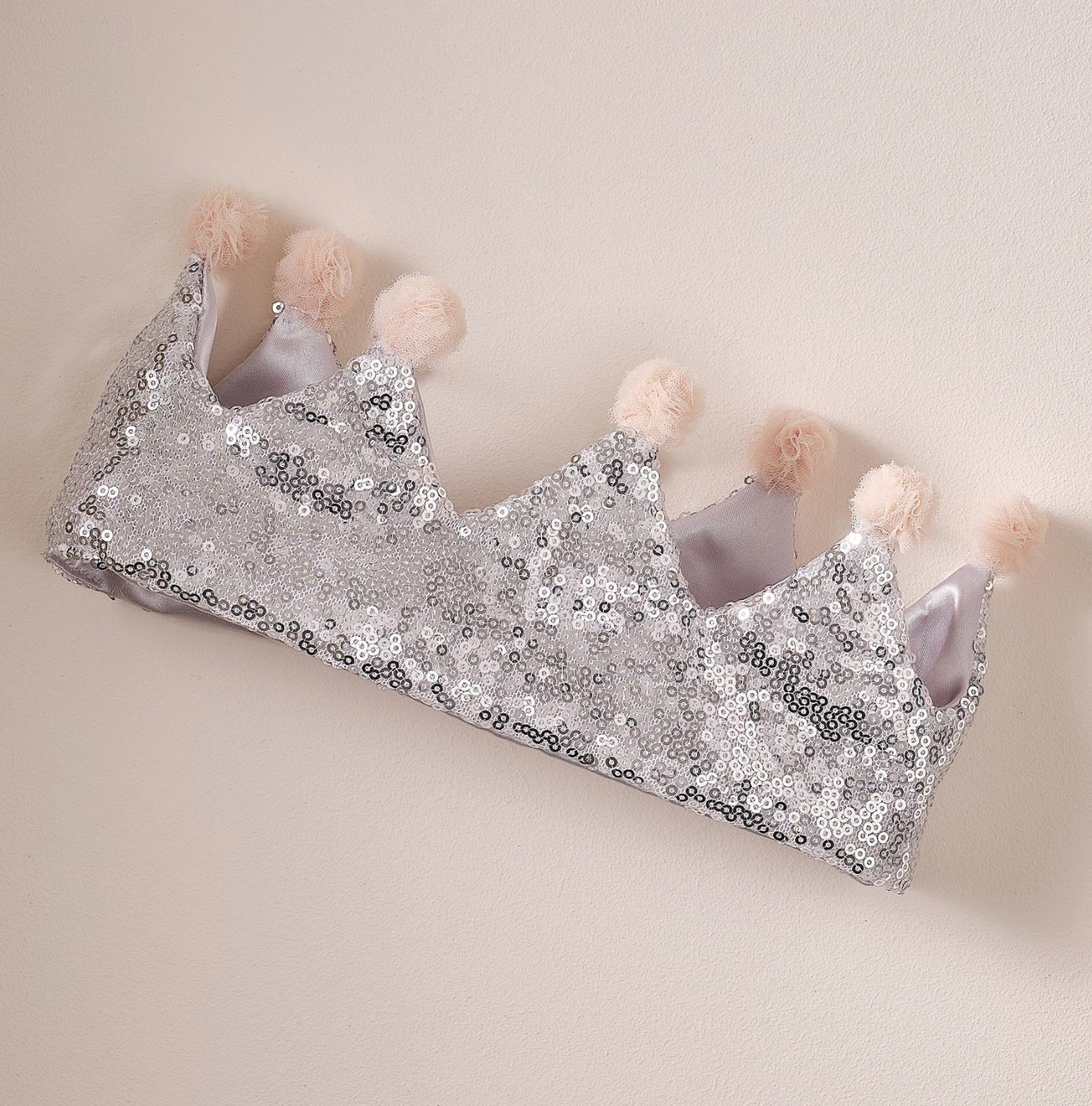 Questa corona di compleanno di alta qualità è completamente ricoperta di scintillanti paillettes argentate. Dettagli deliziosi come i pompon rosa pallido sulle punte le conferiscono un fascino giocoso. Misura circa 21 cm di larghezza e 13 cm di altezza. Il materiale è piacevolmente morbido e flessibile, per cui la corona non sarà d'intralcio nemmeno quando i bambini corrono all'impazzata. Un nastro di raso grigio assicura una tenuta sicura e personalizzata per le teste dei bambini piccoli e grandi.