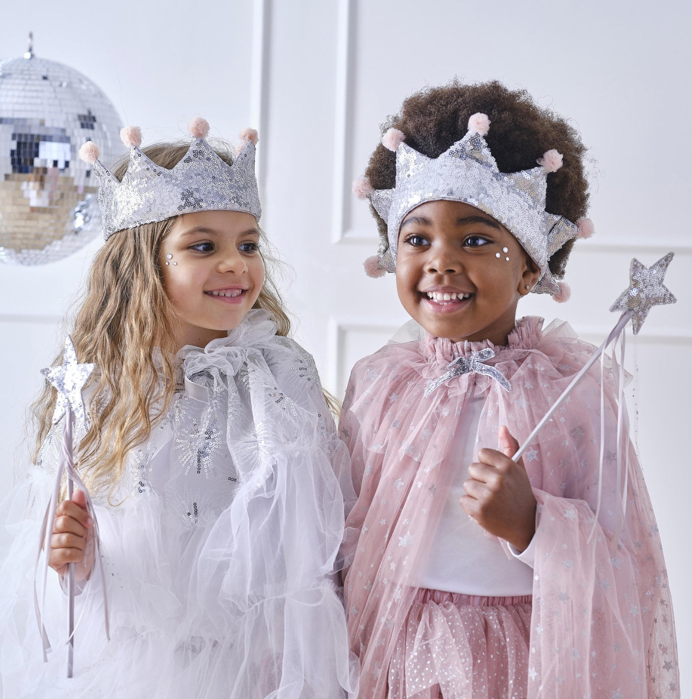 La bambina indossa la corona e si sente subito una vera principessa. Le paillettes argentate scintillano a ogni movimento e i piccoli pon-pon rosa danzano insieme. La corona in morbido tessuto non pizzica e può essere regolata perfettamente sulla testa della bambina grazie al nastro da annodare. In questo modo, rimane comoda e sicura per tutto il giorno, senza scivolare. Dopo la festa, diventerà il pezzo preferito nella scatola dei travestimenti e sarà pronta per molte altre avventure.