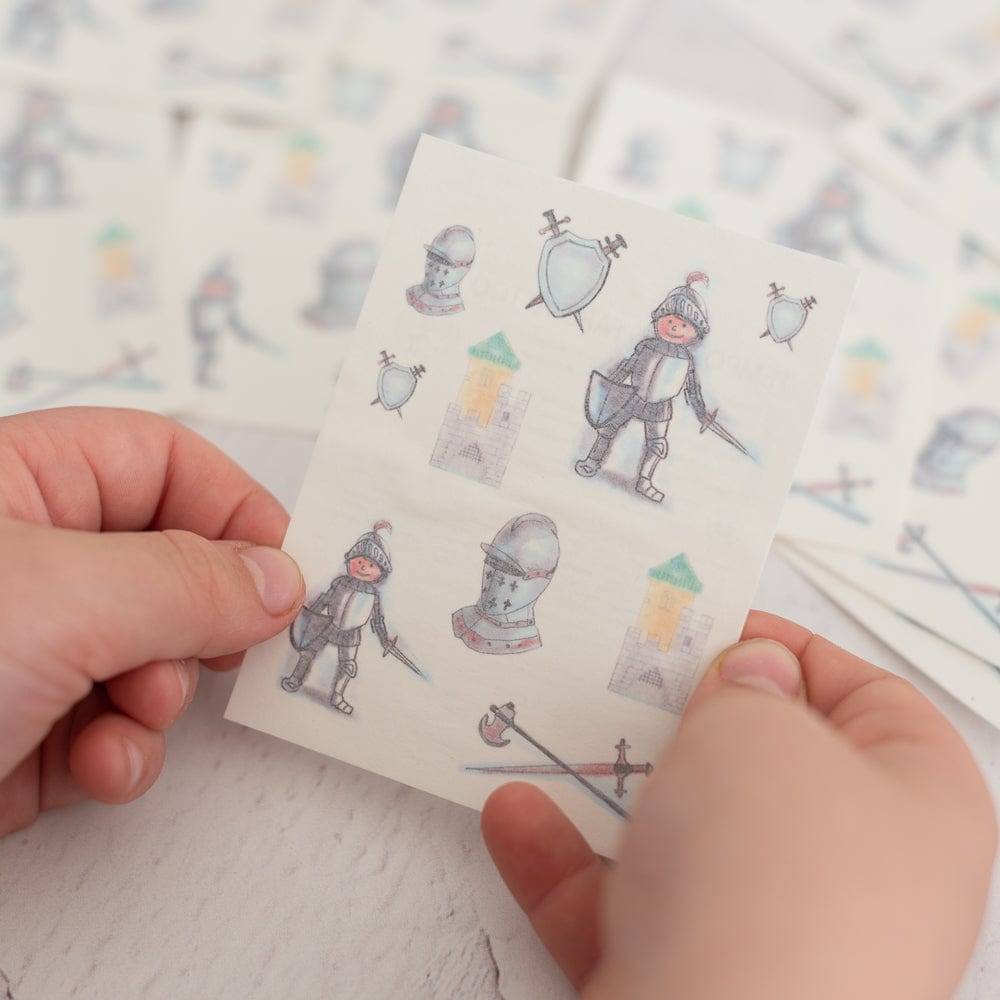 Stell Dir vor, wie die kleinen Gäste auf der Ritterparty stolz ihre funkelnde Rüstung auf der Haut tragen. Jedes Kind sucht sich sein Lieblingsmotiv aus - einen tapferen Ritter, eine stolze Burg oder ein glänzendes Schwert. Das Aufbringen ist ein Riesenspass, den sie fast allein schaffen und der sie sofort ins mittelalterliche Abenteuer katapultiert. Für Dich bedeutet das eine einfache und beliebte Beschäftigung, die ohne Kleber und Schere auskommt. Die Tattoos sind auch eine wunderbare Kleinigkeit, um die Mitgebseltüten für die tapfere Ritterschar zu füllen.