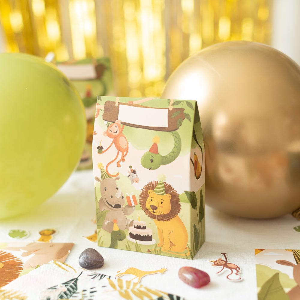 Du erhältst ein Set mit 10 stabilen Partytüten aus Pappe. Mit den Massen von 13 x 14 x 7 cm bieten sie genug Platz für kleine Mitgebsel, Süssigkeiten oder ein Stück vom Geburtstagskuchen. Das liebevolle Design zeigt fröhliche Safari-Tiere wie Löwe, Nashorn und Affe mit Partyhüten und sorgt sofort für gute Laune. Die Tüten lassen sich durch die Falttechnik einfach aufbauen und stehen von selbst, was das Befüllen für Dich besonders unkompliziert macht.