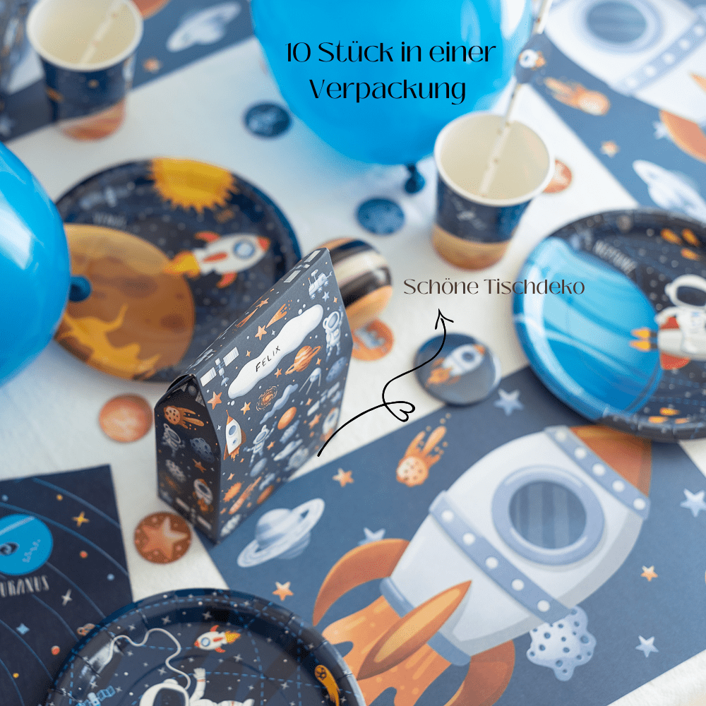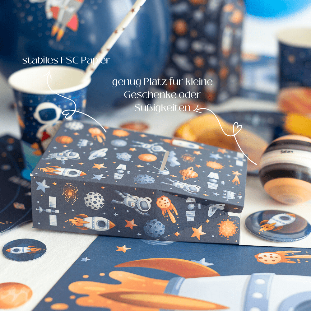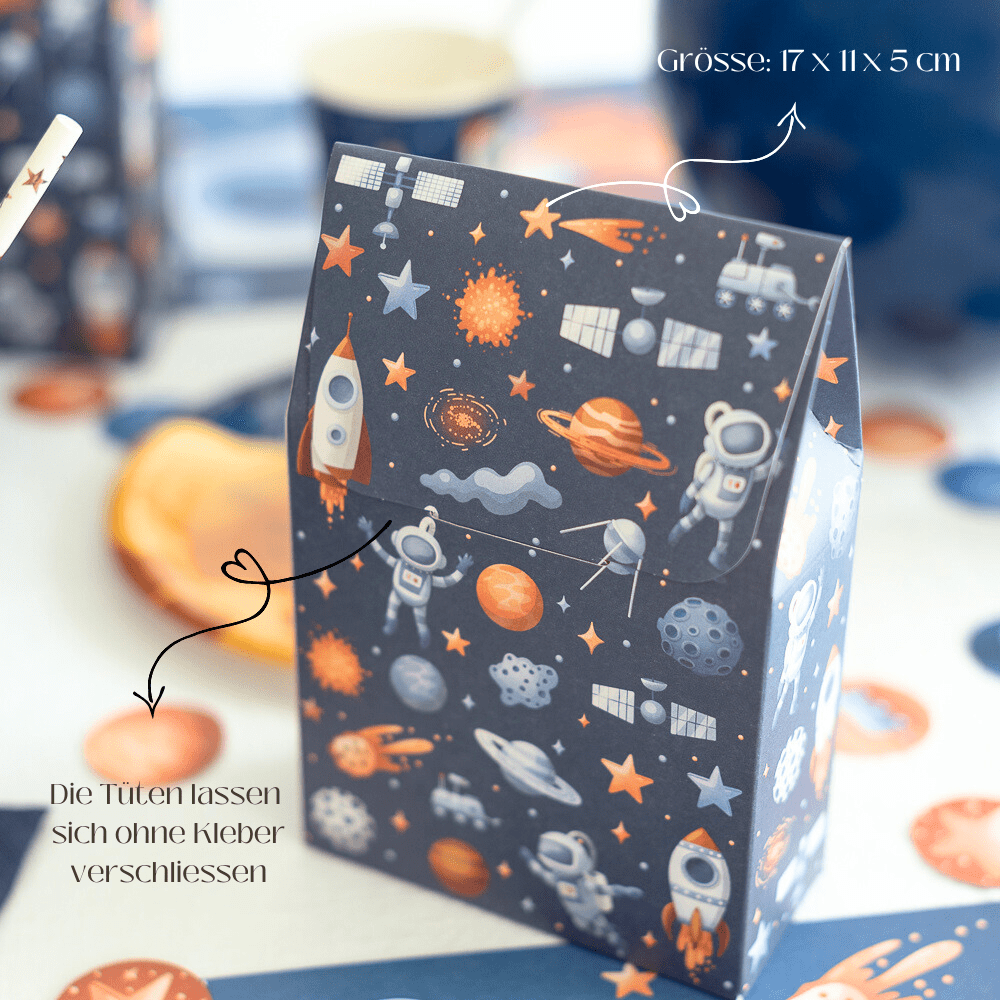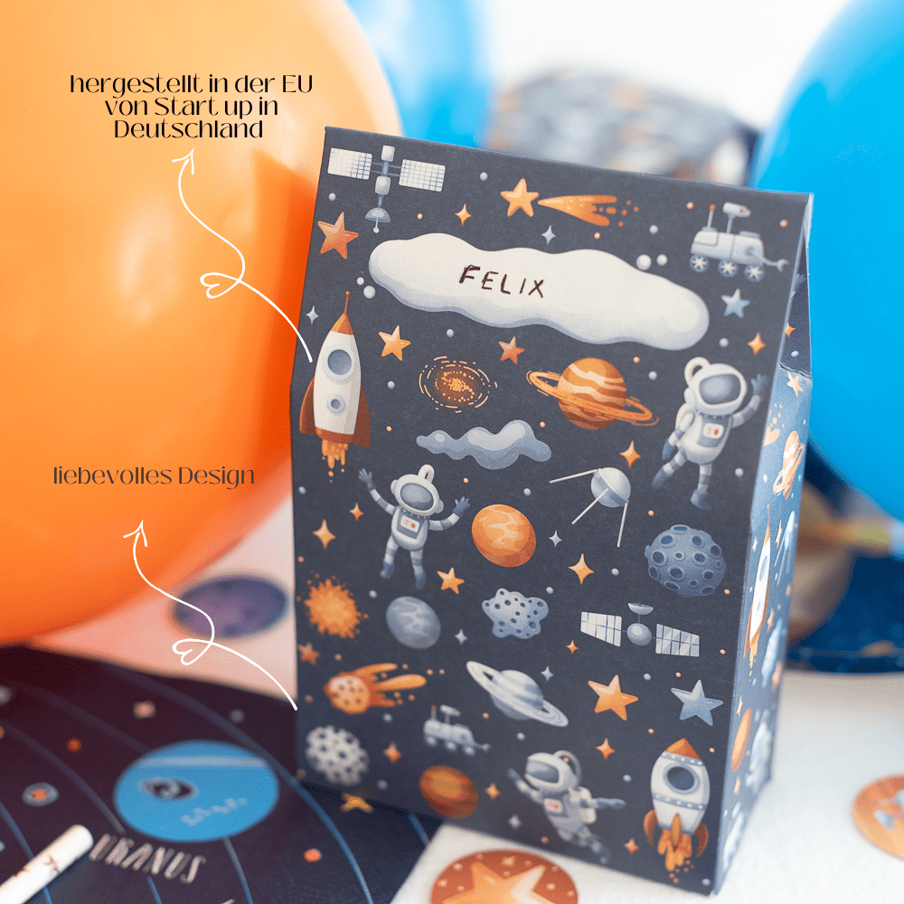 Am Ende der Party strahlen die kleinen Astronauten, wenn sie ihre ganz persönliche Weltraum-Tüte in den Händen halten. Dank des praktischen Namensfeldes weiss jedes Kind sofort, welcher Schatz ihm gehört - ein stolzer Moment, der den Abschied versüsst. Für Dich bedeutet das eine stressfreie Übergabe der Gastgeschenke. Die Tütchen sind schnell aufgefaltet, befüllt und dank des stabilen Bodens stehen sie ordentlich bereit, ohne umzufallen. So bleibt der Abschied geordnet und herzlich.