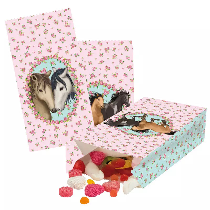 Das Set enthält 8 stabile Papiertüten mit einer Grösse von jeweils 12 x 19 cm. Sie bieten genug Platz für kleine Überraschungen, Süssigkeiten oder ein Stück vom Geburtstagskuchen. Ebenfalls im Lieferumfang enthalten sind 8 passende Namenssticker, mit denen Du oder die Kinder die Tüten einfach personalisieren könnt. Das liebevoll gestaltete Design mit Pferden und kleinen Rosen passt perfekt zu einem Mädchentraum-Geburtstag und macht die Tüten selbst schon zu einem kleinen Highlight.